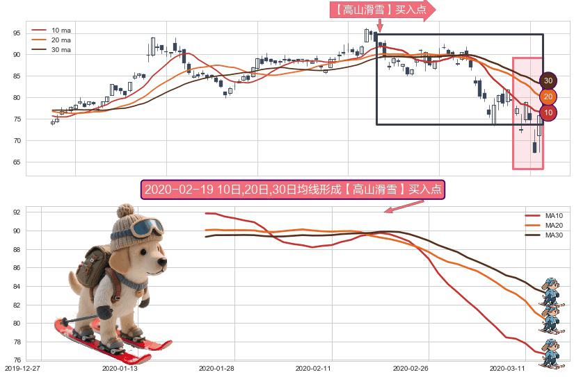 ⚀ 2020-01-23日-2020-03-13日显现 10日-20日-30日均线 【高山滑雪】买入点 看多信号,后市看涨,买入