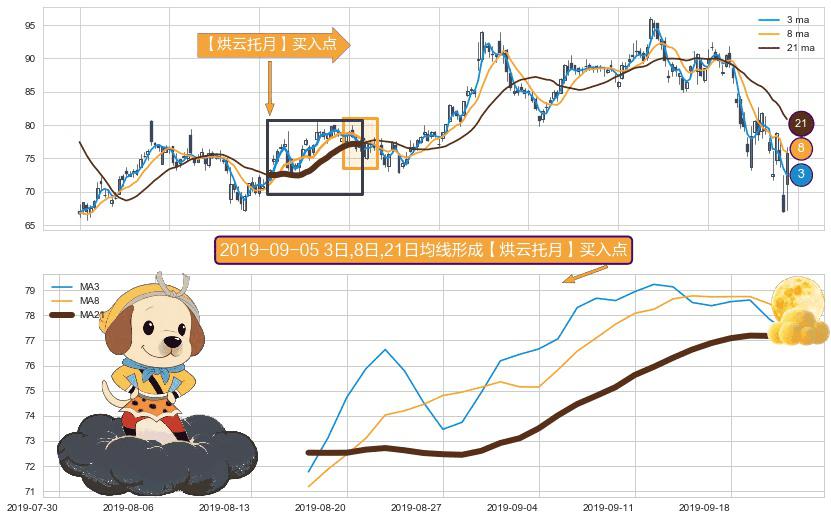 ⚀ 2019-08-16日-2019-09-23日显现 3日-8日-21日均线 【烘云托月】买入点 看多信号,后市看涨,买入