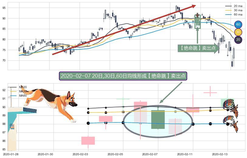 ⚀ 2020-02-07日显现 20日-30日-60日均线 【绝命跳】卖出点 看空信号,后市看跌,卖出