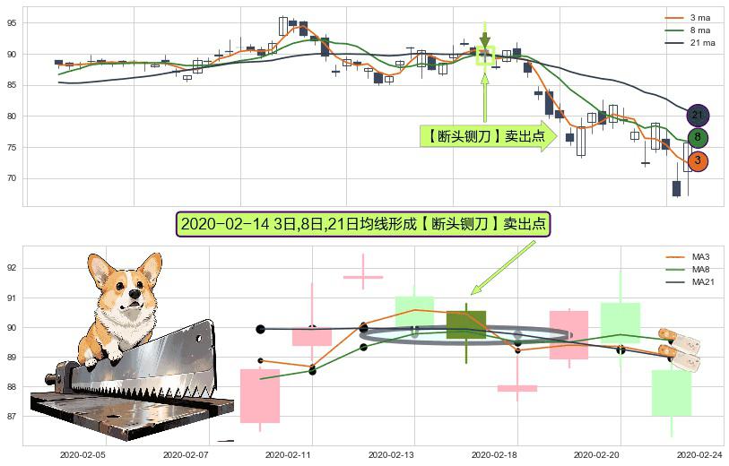 ⚀ 2020-02-14日显现 3日-8日-21日均线 【断头铡刀】卖出点 看空信号,后市看跌,卖出