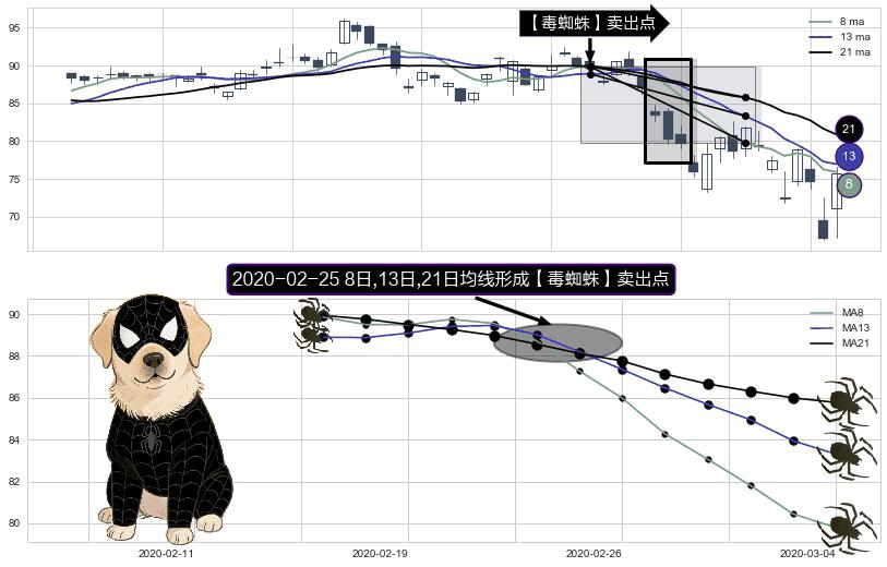 ⚀ 2020-02-25日显现 8日-13日-21日均线 【毒蜘蛛】卖出点 看空信号,后市看跌,卖出