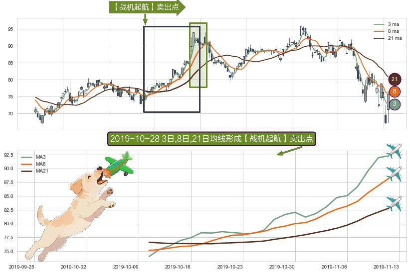 ⚀ 2019-10-10日-2019-11-12日显现 3日-8日-21日均线 【战机起航】卖出点 看空信号,后市看跌,卖出