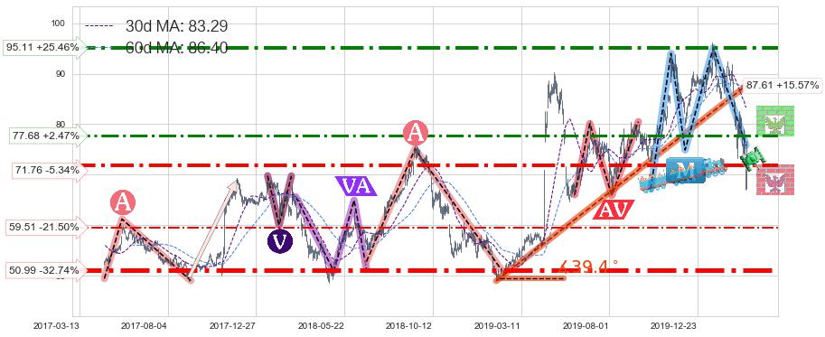♘ 阻力价格位77.68,可信任强度68.65%,距离最后交易2020-03-13形成的收盘价格75.81相差 +2.47%