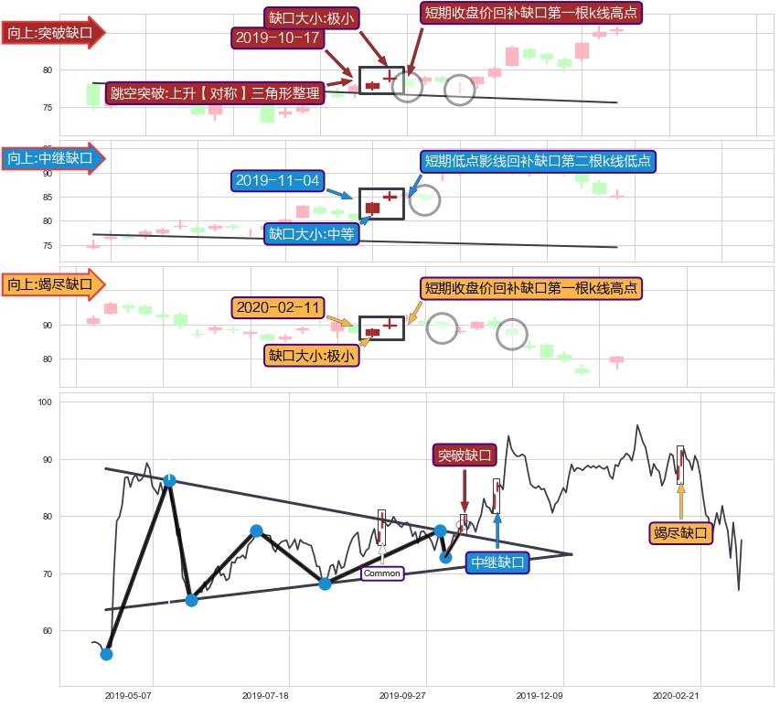 ➣ 普通缺口在【上升【对称】三角形整理】震荡整理形态中出现