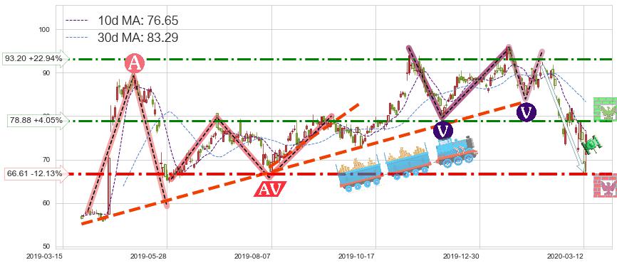 ➢ AI预测: 假定反转如期而至,第❶价格目标位置(2020-03-19, 78.06)