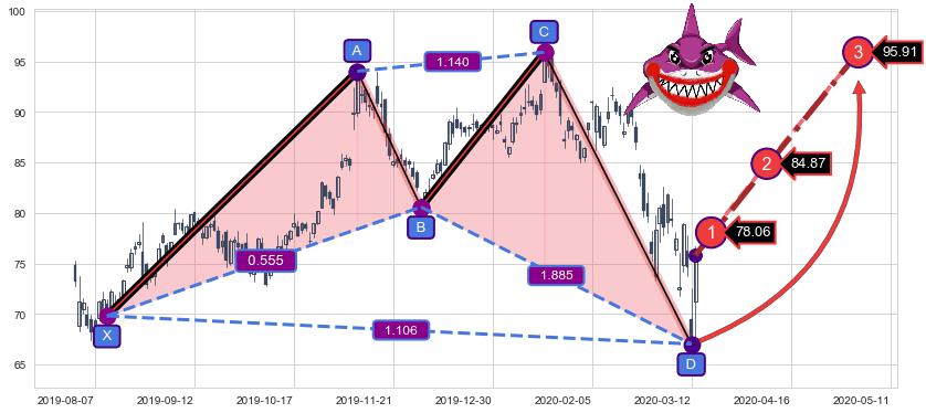 ➣ 已完成【鲨鱼】形态起点X: 2019-08-12, 终点D: 2020-03-12, 共148交易日