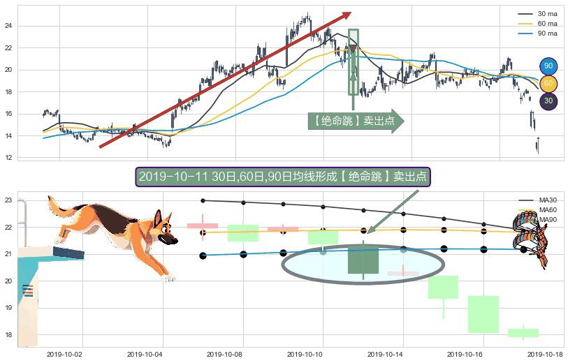 形态多维评估: ⚀ 2019-10-11日显现 30日-60日-90日均线 【绝命跳】卖出点 看空信号,后市看跌,卖出