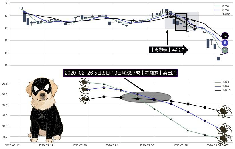 形态多维评估: ⚀ 2020-02-26日显现 5日-8日-13日均线 【毒蜘蛛】卖出点 看空信号,后市看跌,卖出