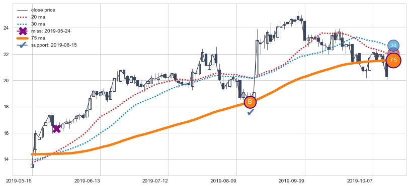 上涨趋势2019-05-15-2019-10-11,均线75确认关键支撑1处