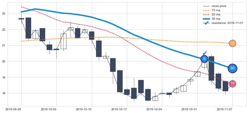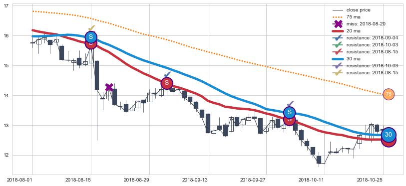 下跌趋势2018-08-01-2018-10-25,均线20, 30确认关键阻力3处