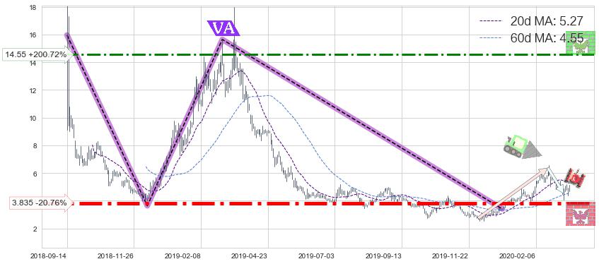♘ 阻力价格位14.55,可信任强度60.40%,距离最后交易2020-03-13形成的收盘价格4.84相差 +200.72%
