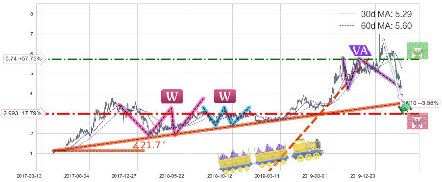 🍖 长线趋势跟踪组合短线均值回复[强支撑信号]2017-04-18-2020-03-11上升趋势依然成立(上涨趋势跟踪依然可行),短线价格略微下行回调(均值回复猜想),即将接近趋势提供的未破位的支撑价格:3.510。
