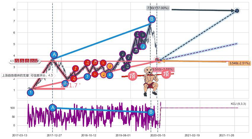 ♘ 在最后的上升阶段2017-04-18至2020-03-11存在 持续未破位的支撑位 ,支撑价格3.510,支撑可信任强度88.19%,其距离最后价格3.640相差 -3.58%