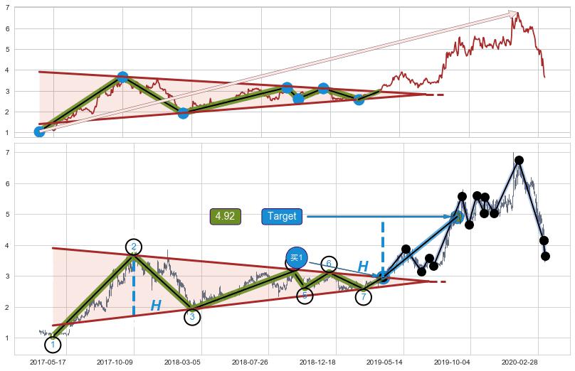 ➢ 最小中继整理涨幅→𝐇: 1.9626 (高点逐步降低斜边第一阻力点②与支撑边垂直距离)