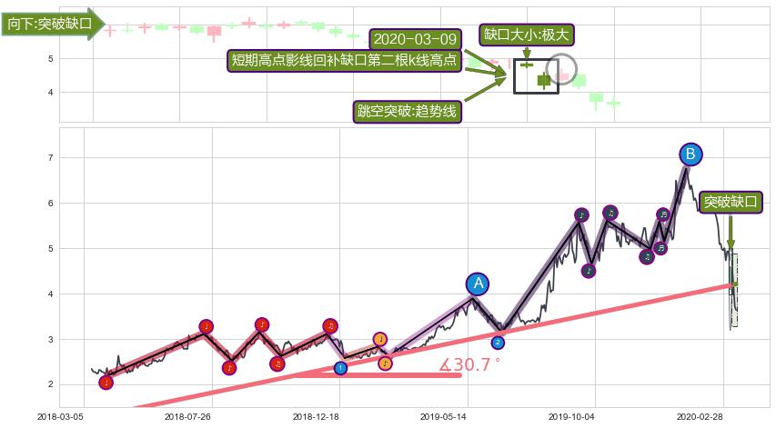 ➢ 2018-04-02-2020-03-12上升趋势存在反转[风险],其原上升趋势的支撑位(4.21)已破位[强阻力信号],原上升趋势角度: 30.7˚