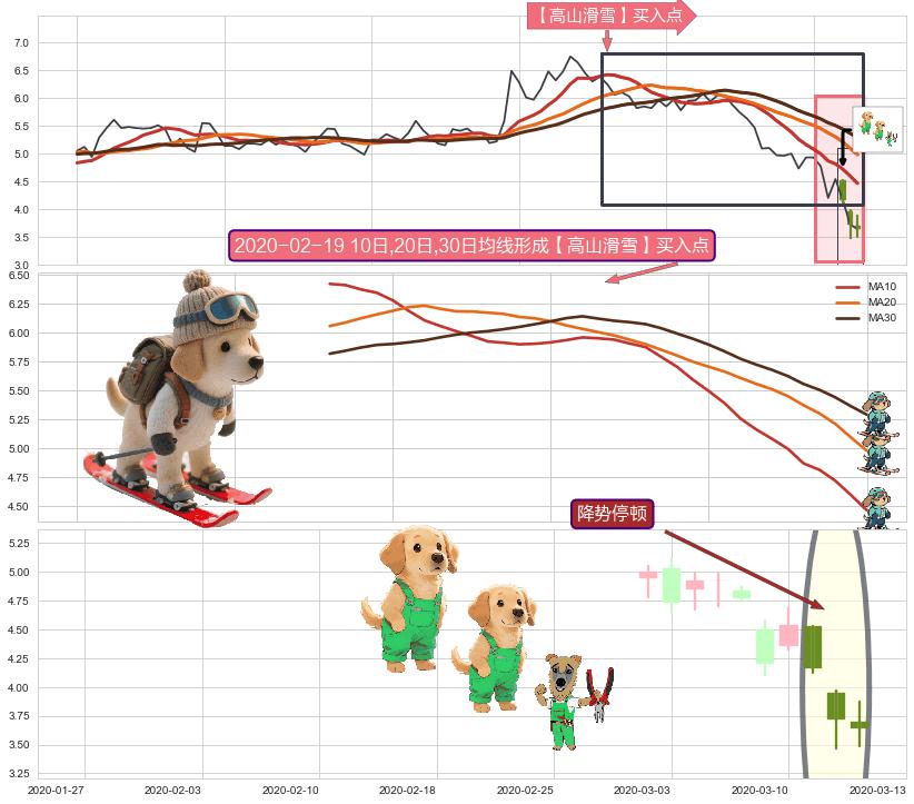 ➢ 高点影线(2020-03-10: 4.68 )→回踩→第二根k线高点(2020-03-09: 4.58 )