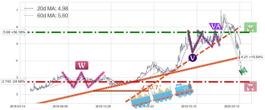 ✂️ 2018-04-02-2020-03-12上升趋势存在反转[风险],其原上升趋势的支撑位(4.21)已破位[强阻力信号],原上升趋势角度: 30.7˚