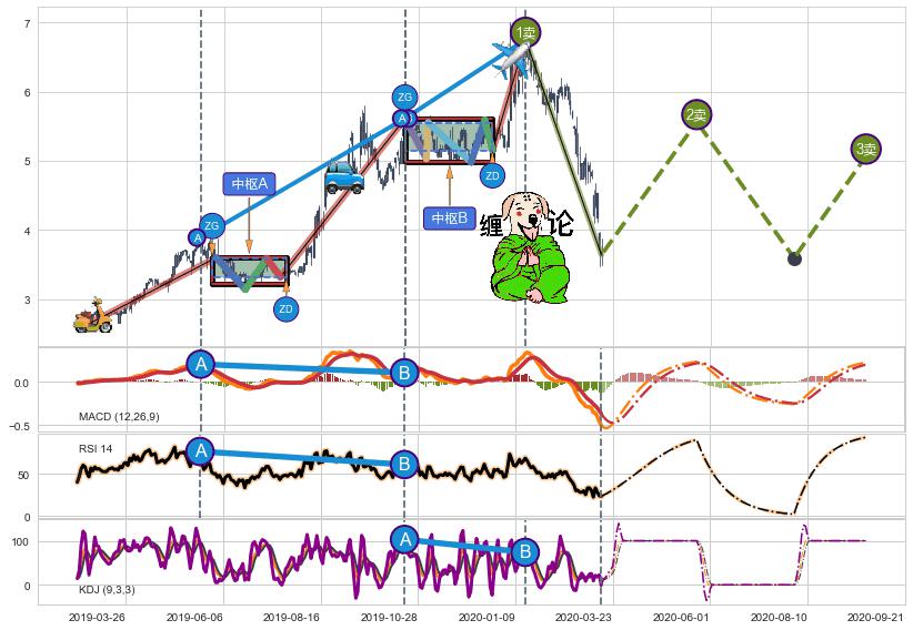 ➢ 【中枢A】:2019-05-31-2019-07-18,中枢由4笔构成,共34交易日, ZG=3.590, ZD=3.320