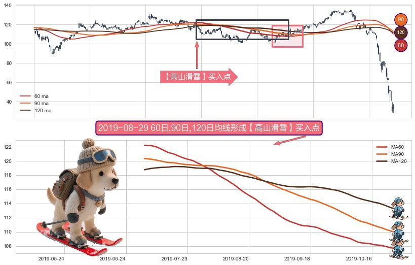 高山滑雪是均线组合看多见底信号,后市看涨,买入信号,其特征为股价在加速下跌前呈现缓慢或匀速下跌,均线呈现空头排列,形似滑雪者加速下滑的轨迹, 出现在长期下降趋势或中期调整行情中,股价越跌越快,均线系统短期均线与长期均线形成向下发散的空头排列, 大角度向下进入下一个台阶, 像是顺山坡飞驰而下的滑雪运动员,所以就被称作是高山滑雪
