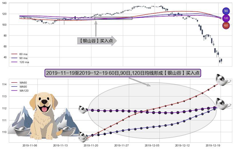 形态多维评估: ⚀ 2019-11-20-日至2019-12-19-日显现 60日-90日-120日均线 【银山谷】买入点 看多信号,后市看涨,买入