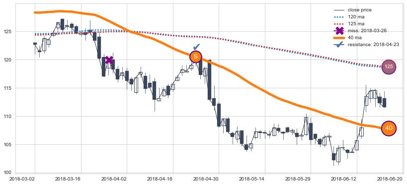 下跌趋势2018-03-02-2018-06-20,均线40确认关键阻力1处