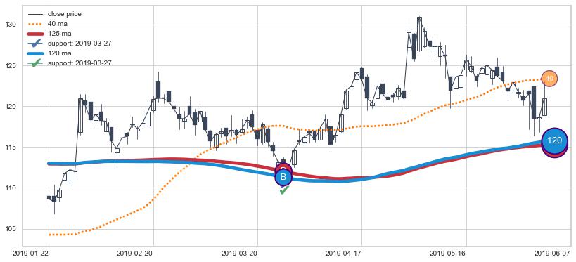 上涨趋势2019-01-22-2019-06-07,均线120, 125确认关键支撑1处