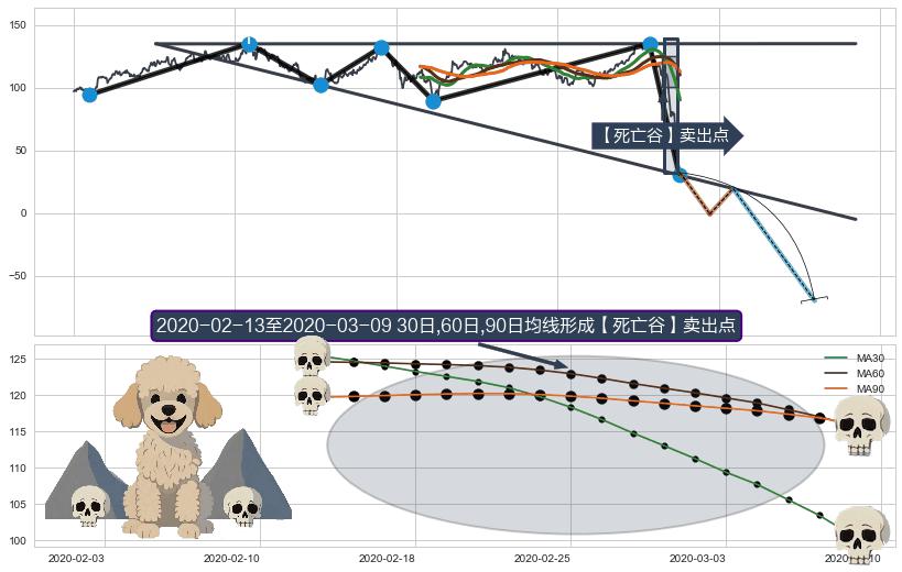 | 12 🅚:三只乌鸦 ➕ 🎢:【死亡谷】卖出点均线组合卖出点信号形成后,猜想后续破位下跌,沿着向下的尖头三角下跌 ☞ 看空信号 ⇥ 【均线】交织【🅚线】⇥ 综合量化分数: 40 | > |
