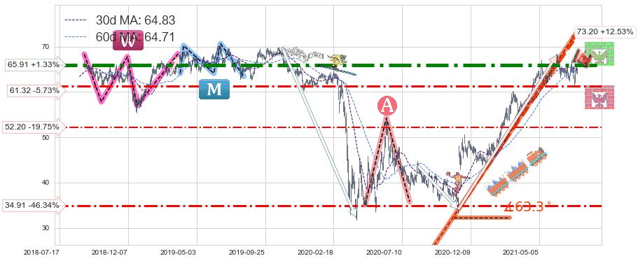 ♘ 阻力价格位65.91,可信任强度95.21%,距离最后交易2021-07-23形成的收盘价格65.05相差 +1.33%