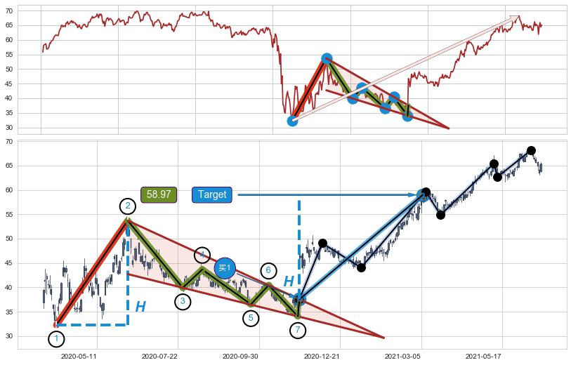 ➢ 最小中继整理涨幅→𝐇: 21.43 (𝐇楔型旗杆的长度:楔型起点→顶点)