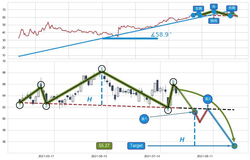 ➣ 最小反转跌幅→𝐇: 5.90 (头部与颈线垂直距离)