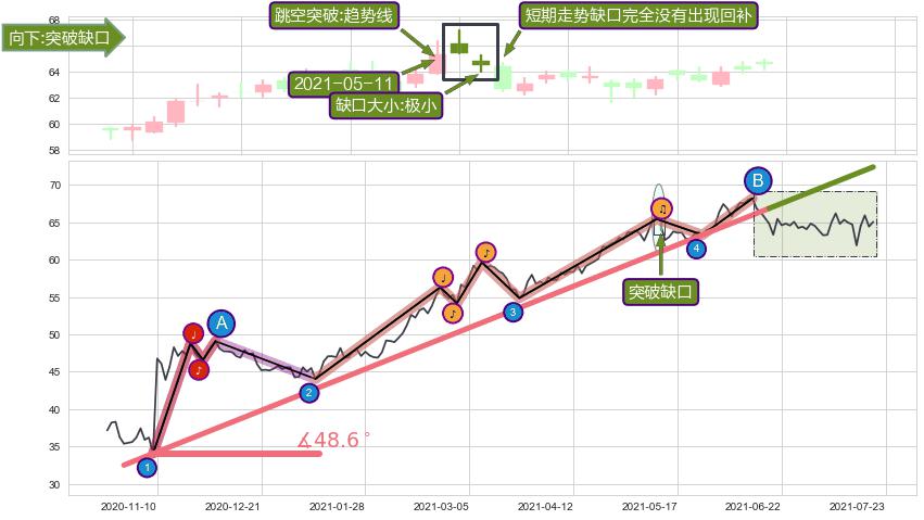 从2020-10-28至2021-06-17,共包含156个交易日,阶段股价上涨68.65%,阶段股价变动位移路程比: 1 : 3,上涨趋势角度: 48.6,2020-11-10向⇪形成缺口,跳空上涨+37.37%