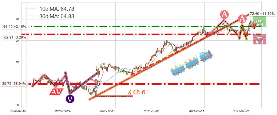 ♘ 阻力价格位66.45,可信任强度70.78%,距离最后交易2021-07-23形成的收盘价格65.05相差 +2.16%