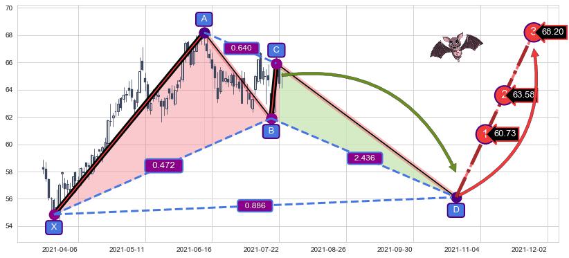 ➣ 未完成【蝙蝠】形态起点X: 2021-03-23, 已到达C点: 2021-07-21, 预测最终D点: 2021-10-22, 共150交易日