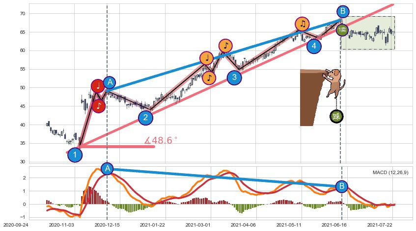 ➣ 2020-10-28-2021-06-17上升趋势存在反转[风险],其原上升趋势的支撑位(72.40)已破位[强阻力信号],原上升趋势角度: 48.6˚