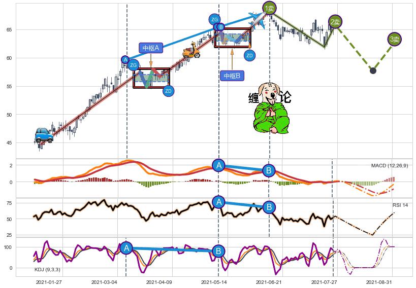 ➣ 【中枢B】:2021-05-11-2021-05-24,中枢由5笔构成,共10交易日, ZG=63.72, ZD=62.75