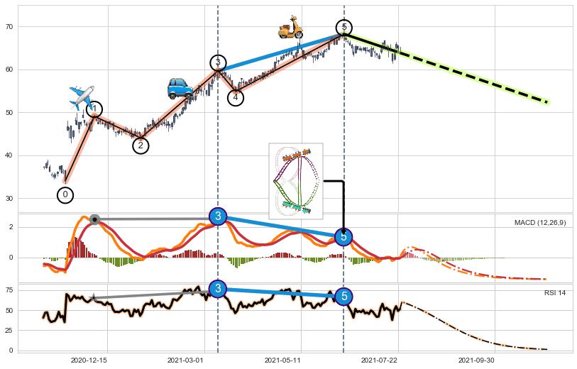 ➣ 第一, 三, 五浪上涨动能逐渐【衰弱变小】,趋势呈现不稳迹象