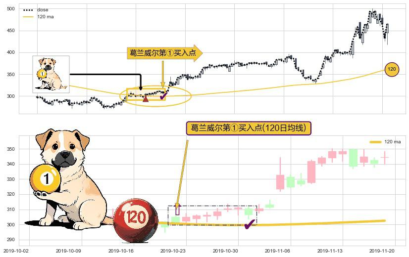 形态多维评估: ⚀ 2019-10-22-日显现 葛兰威尔均线 120日均线 第买①入点 走势反转见底信号,后市看涨,买进信号