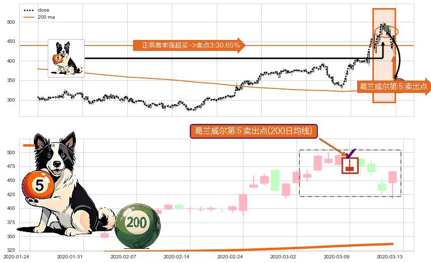 形态多维评估: ⚀ 2020-03-09-日显现 葛兰威尔均线 200日均线 第⑤卖出点 上升趋势均值回复的短线回落信号,后市看跌,卖出信号