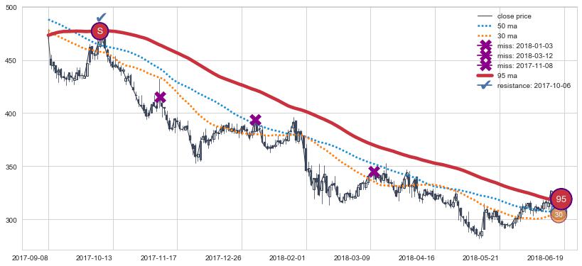 下跌趋势2017-09-08-2018-06-19,均线95确认关键阻力1处