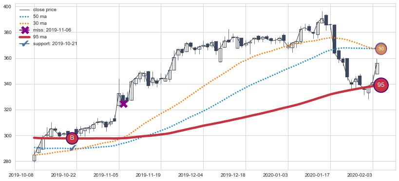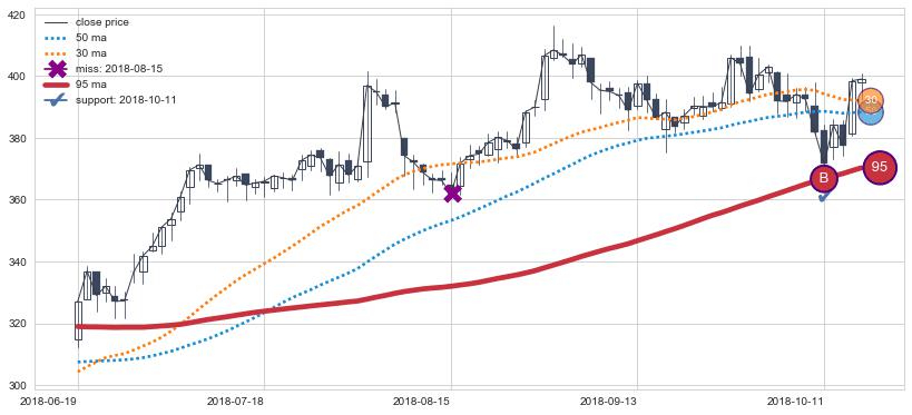 上涨趋势2017-04-05-2017-07-28,均线30, 95确认关键支撑3处