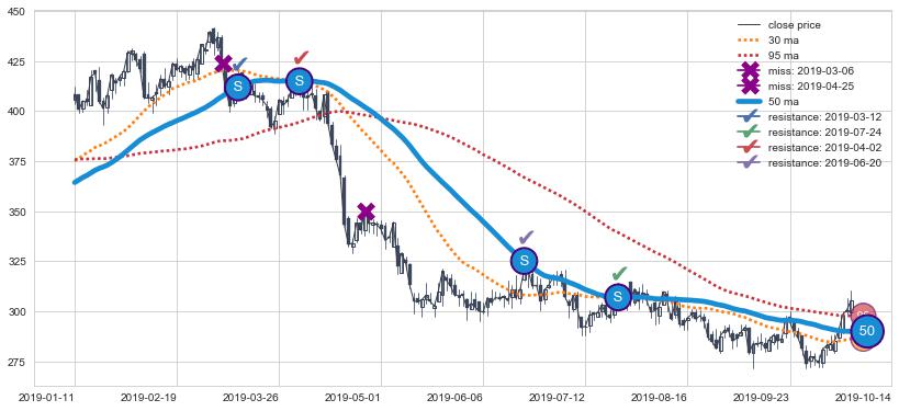 下跌趋势2019-01-11-2019-10-14,均线50确认关键阻力4处