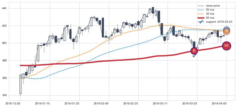 上涨趋势2018-12-26-2019-04-05,均线95确认关键支撑1处