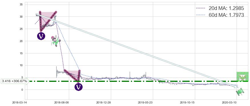 从2018-04-13至2020-03-13,共包含483个交易日,阶段股价下跌-231.41%,阶段股价变动位移路程比: 1 : 6,2018-06-22向↘︎形成缺口,跳空下跌-76.66%˚