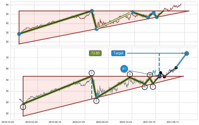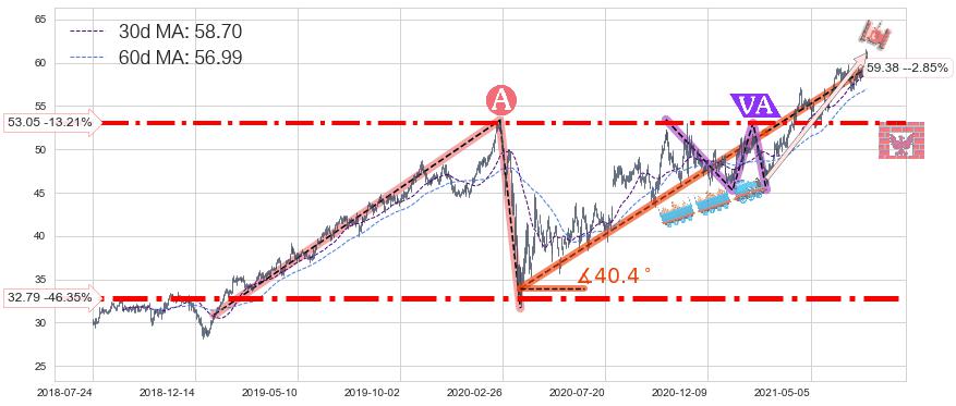 ➢ 【空方力量耗尽,多方打破攻守平衡点】上升三角形中继整理, 已在2021-04-13突破【阻力】颈线 53.35 →演变成上升通道