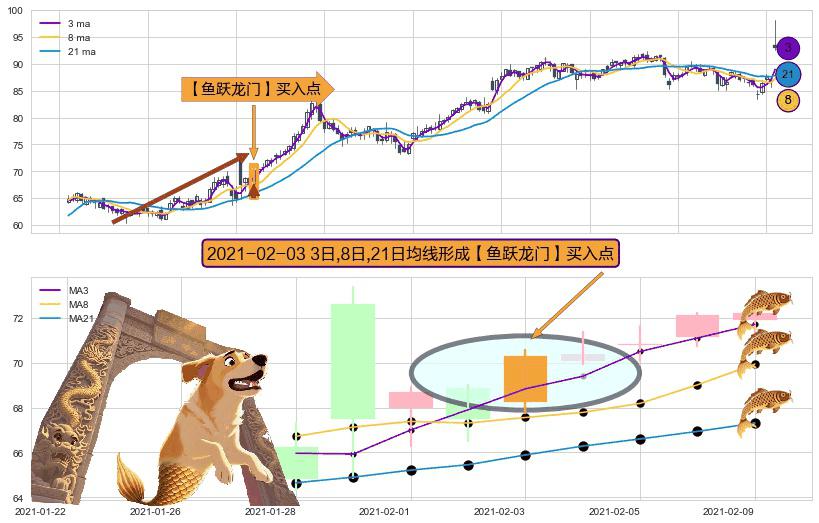 ⚀ 2021-02-03日显现 3日-8日-21日均线 【鱼跃龙门】买入点 看多信号,后市看涨,买入