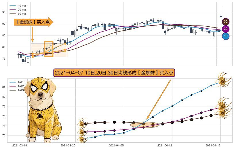 ⚀ 2021-04-07日显现 10日-20日-30日均线 【金蜘蛛】买入点 看多信号,后市看涨,买入