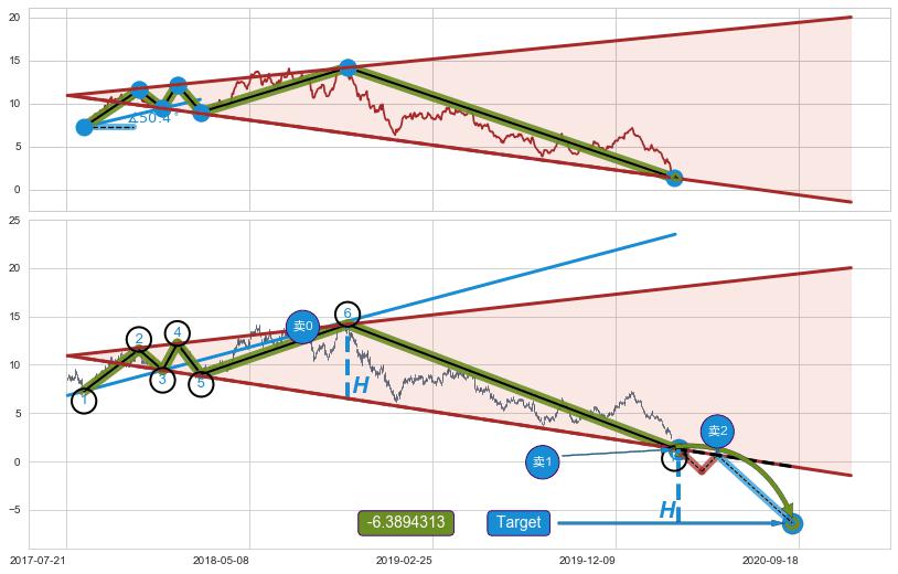 ➢ 最小反转跌幅→𝐇: 7.67 (逐步抬高阻力斜边最后的阻力点⑥与支撑边垂直距离)