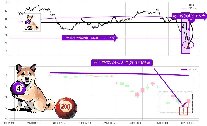 形态多维评估: ⚀ 2020-03-12-日显现 葛兰威尔均线 200日均线 第④买入点 下降趋势均值回复的短线反弹信号,后市看涨,买进信号