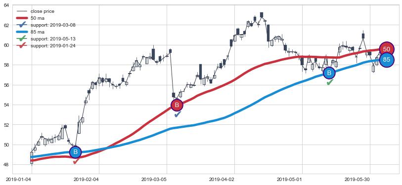上涨趋势2019-01-04-2019-06-04,均线50, 85确认关键支撑3处