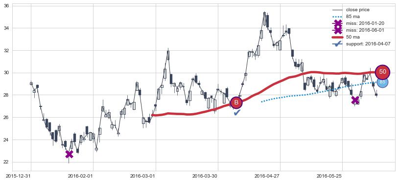 上涨趋势2016-09-20-2017-03-15,均线50, 85确认关键支撑2处